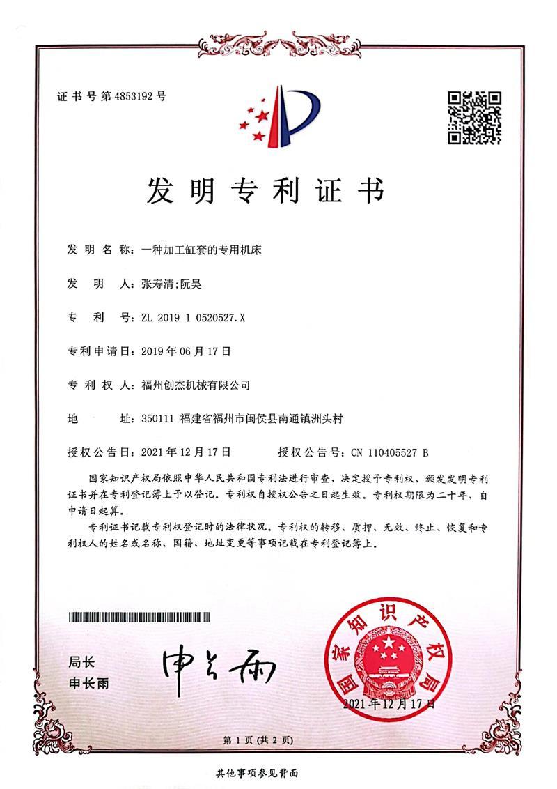 1、2025年12月獲(huo)得“一種缸(gang)套加工的(de)專用機床(chuáng)”的發明專(zhuān)利
